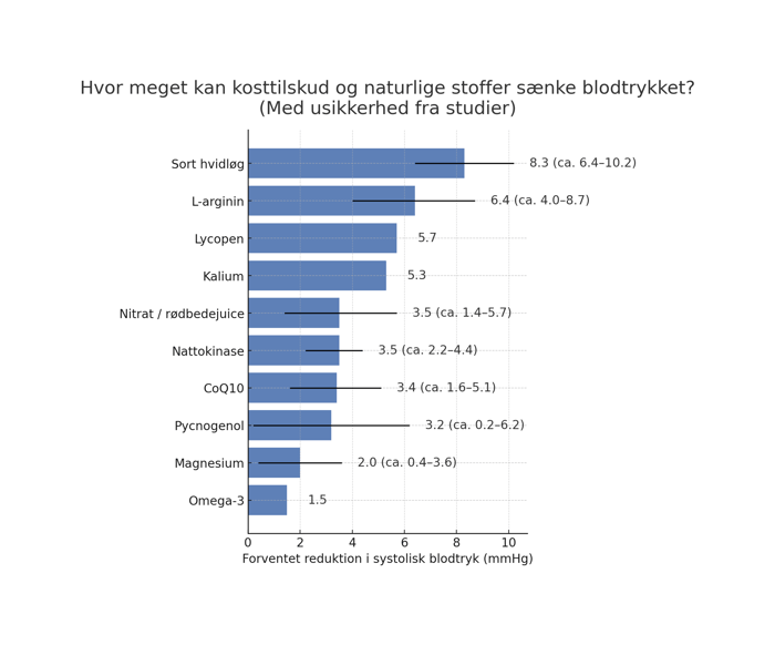 Grafen viser den gennemsnitlige reduktion i systolisk blodtryk for hvert tilskud samt et spænd, hvis dette var angivet i studierne (vist som “ca. min–max”). Resultaterne stammer fra forsøg med personer med forhøjet blodtryk, og effekten vil derfor typisk være mindre hos personer med normalt blodtryk. Da udgangspunktet for blodtrykket varierede mellem studierne, skal tallene ikke opfattes som 100% eksakte, men som vejledende gennemsnit, der illustrerer den omtrentlige effektstørrelse.