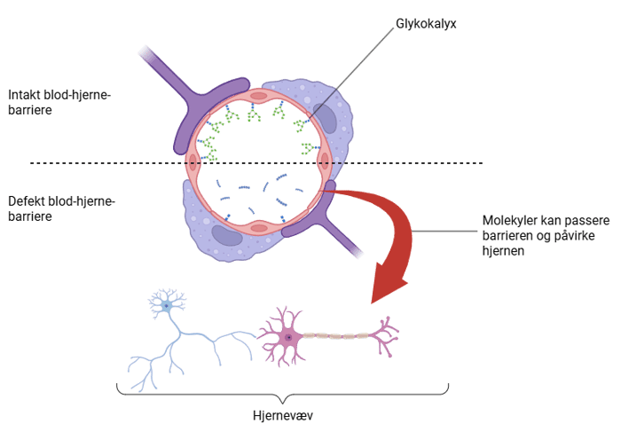 Over den stiplede linje ses en intakt og sund blod-hjerne-barriere, hvor man kan se det beskyttende lag af glykokalyx ("gaffelformede") strukturer. Nederst på figuren ses en beskadiget blod-hjerne-barriere, hvor man kan se, at glykokalyx er blevet helt nedbrudt (blå striber der flyder rundt), og det ikke længere danner en barriere funktion. Det gør, at molekyler er i stand til at passere og påvirke hjernen, som den røde pil viser. Figuren er lavet med Biorender.com.